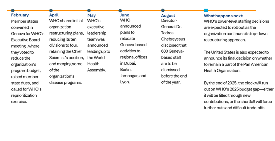 This year, triggered by a looming budget crisis and a call from member states for an assessment of the organization’s programmatic priorities, WHO has been undergoing one of its most significant shake-ups in decades. Since May, WHO has rolled out a steady stream of restructuring updates—reshaping its organizational chart, slashing budgets, cutting staff, and resetting priorities. Below, we break down what’s changed so far, what’s still to come, and why these shifts matter for the future of global health research and development (R&D).